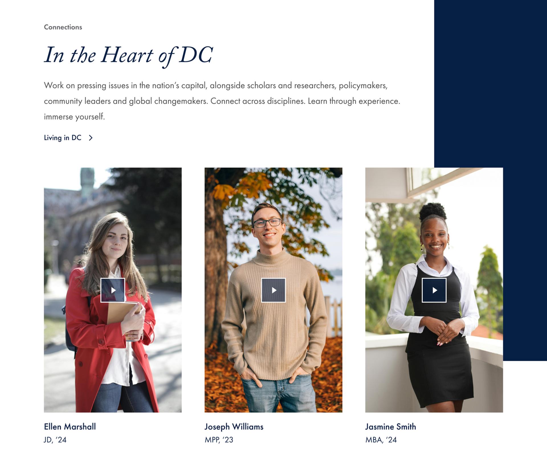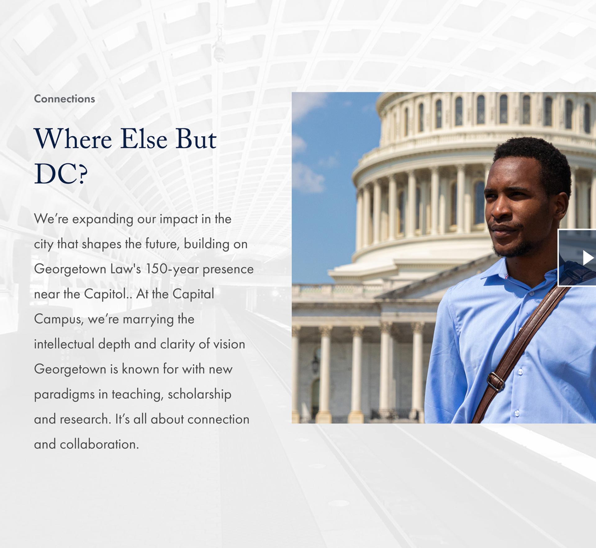 By pulling together two Digital Pulp teams to collaborate closely on the campaign and microsite, we were able to create a coherent communication ecosystem that successfully tells the true story of Georgetown’s Capitol Campus. Not a bunch of buildings; not a separate entity from the Hilltop campus; not a DC newbie; but a step in the evolution of a university that has long been embedded in the city it calls home.
