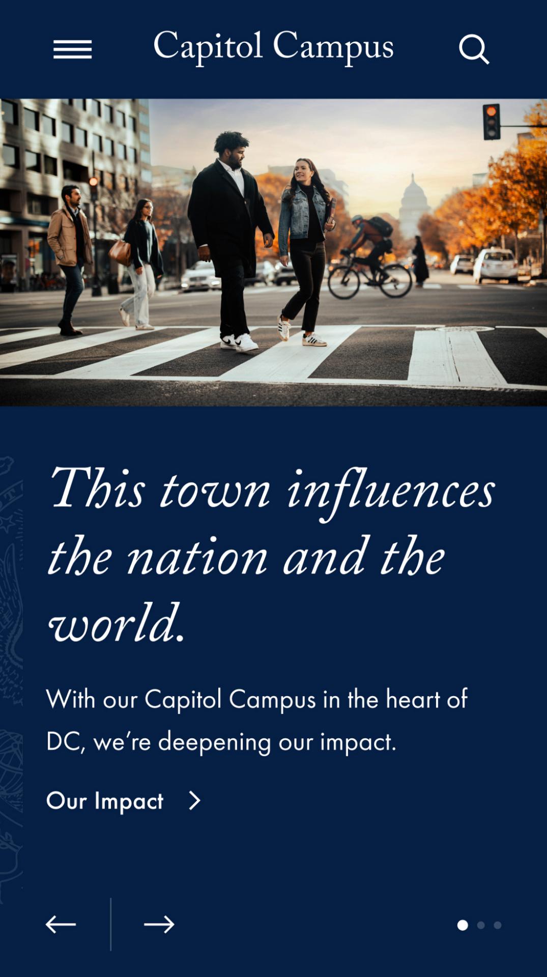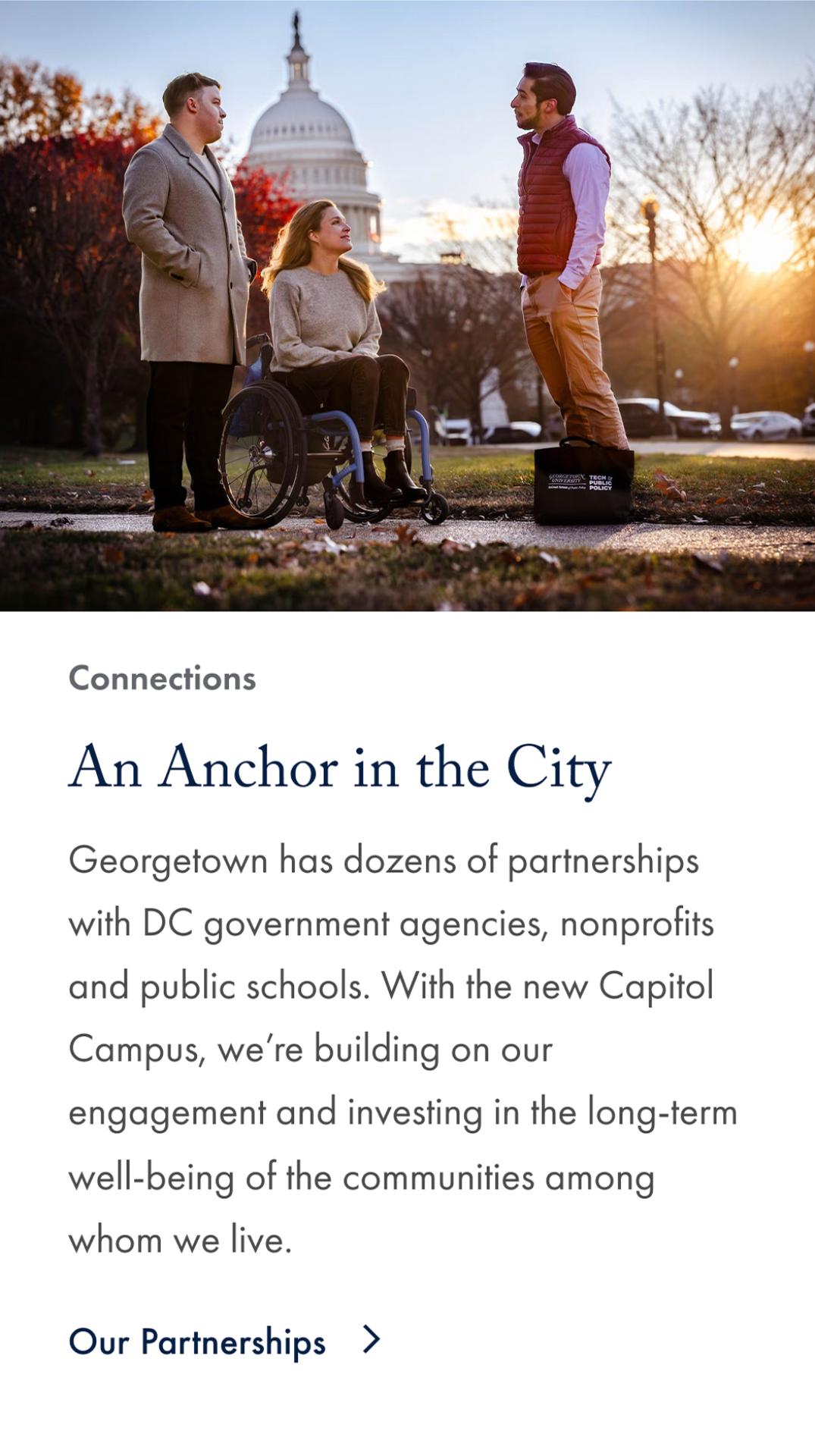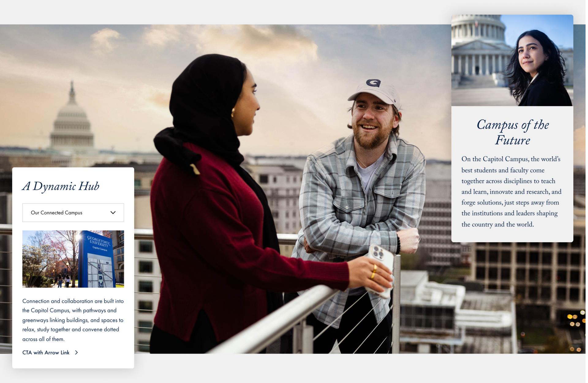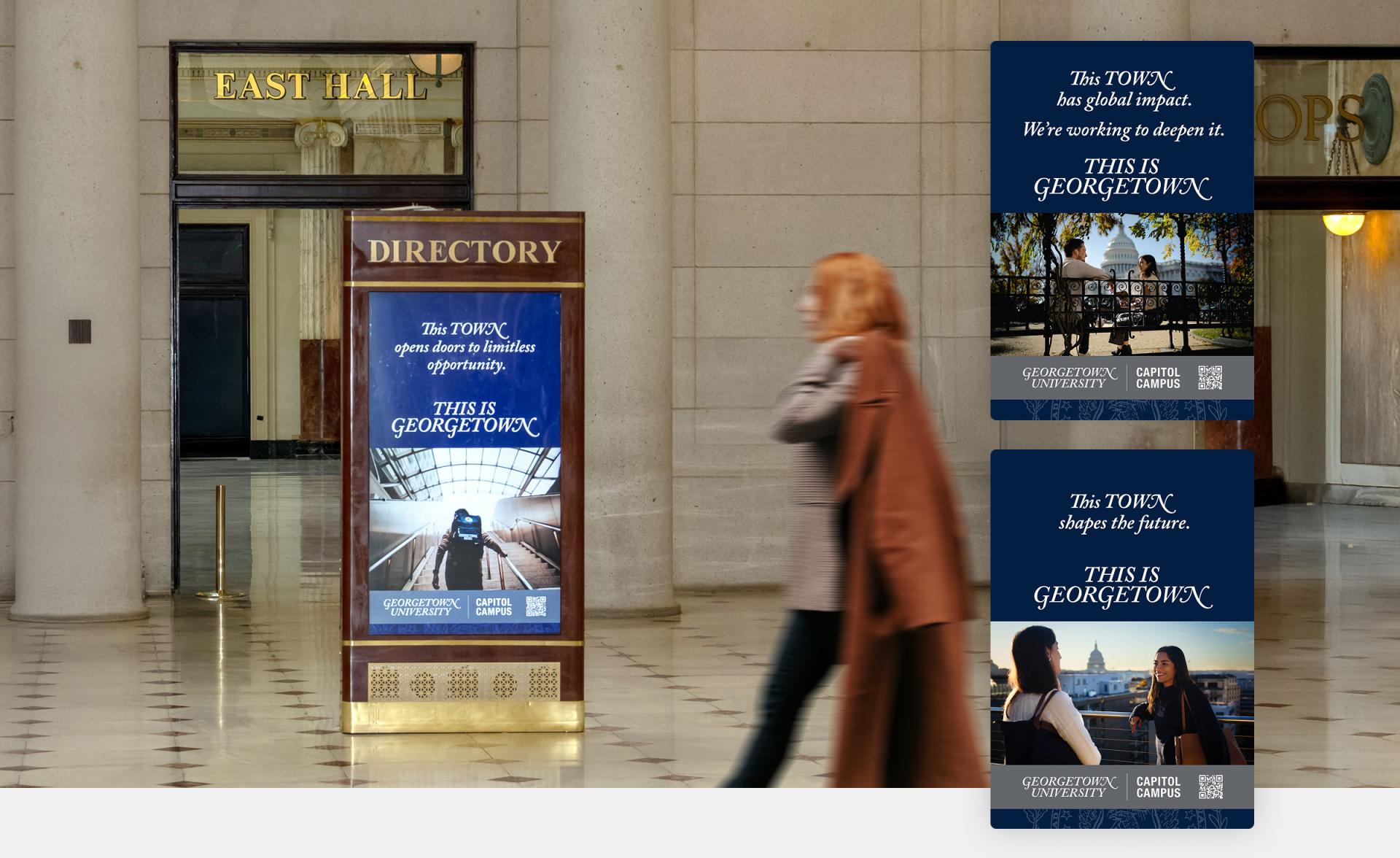 The advertising campaign and microsite supported one another. Campaign lines echoed in the microsite’s homepage hero, and the candid-shot photo style, which we guided, was consistent across both. Most important, each amplified the insights we discovered during a rigorous discovery process and the messaging we developed around the Capitol Campus as an essential part of Georgetown University and the city.