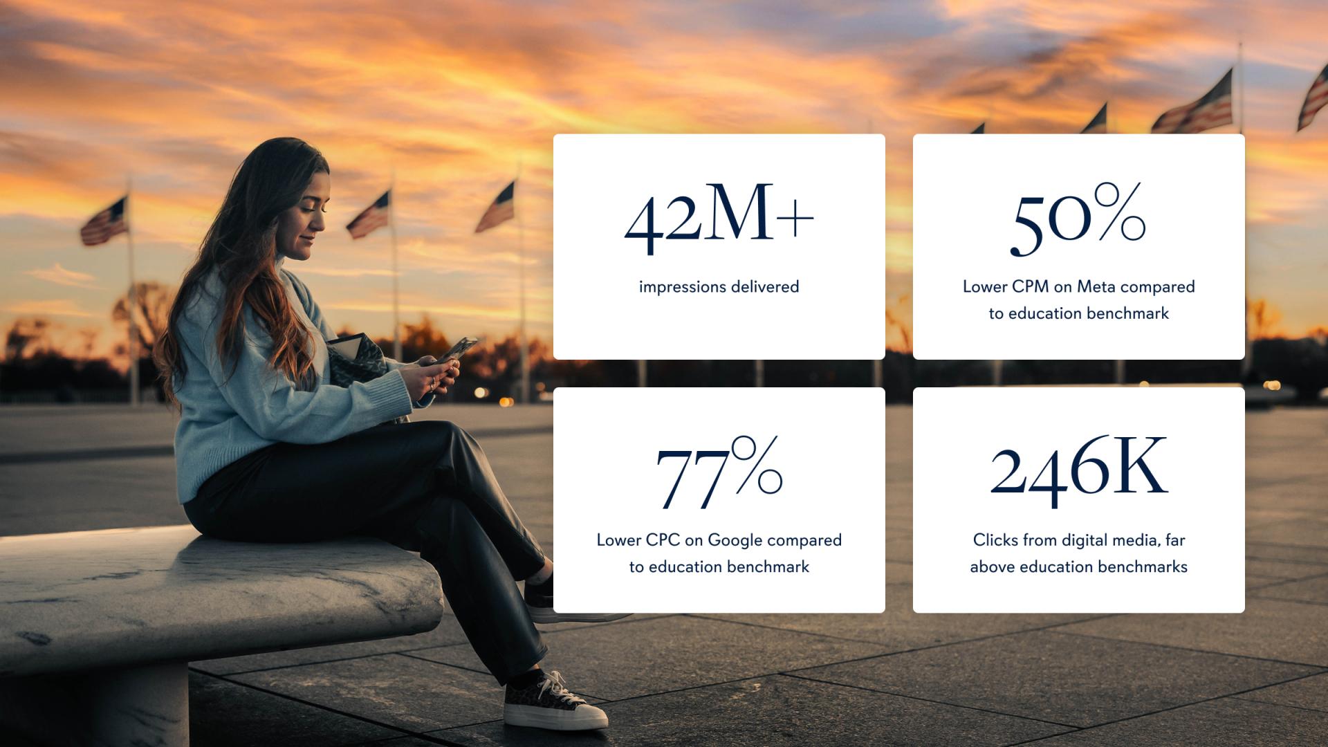 We also developed a paid social strategy with digital ads that linked to the new site. Everything worked in tandem through ownable, focused messaging that communicated the idea of one university, two campuses, with DC as their common home.
