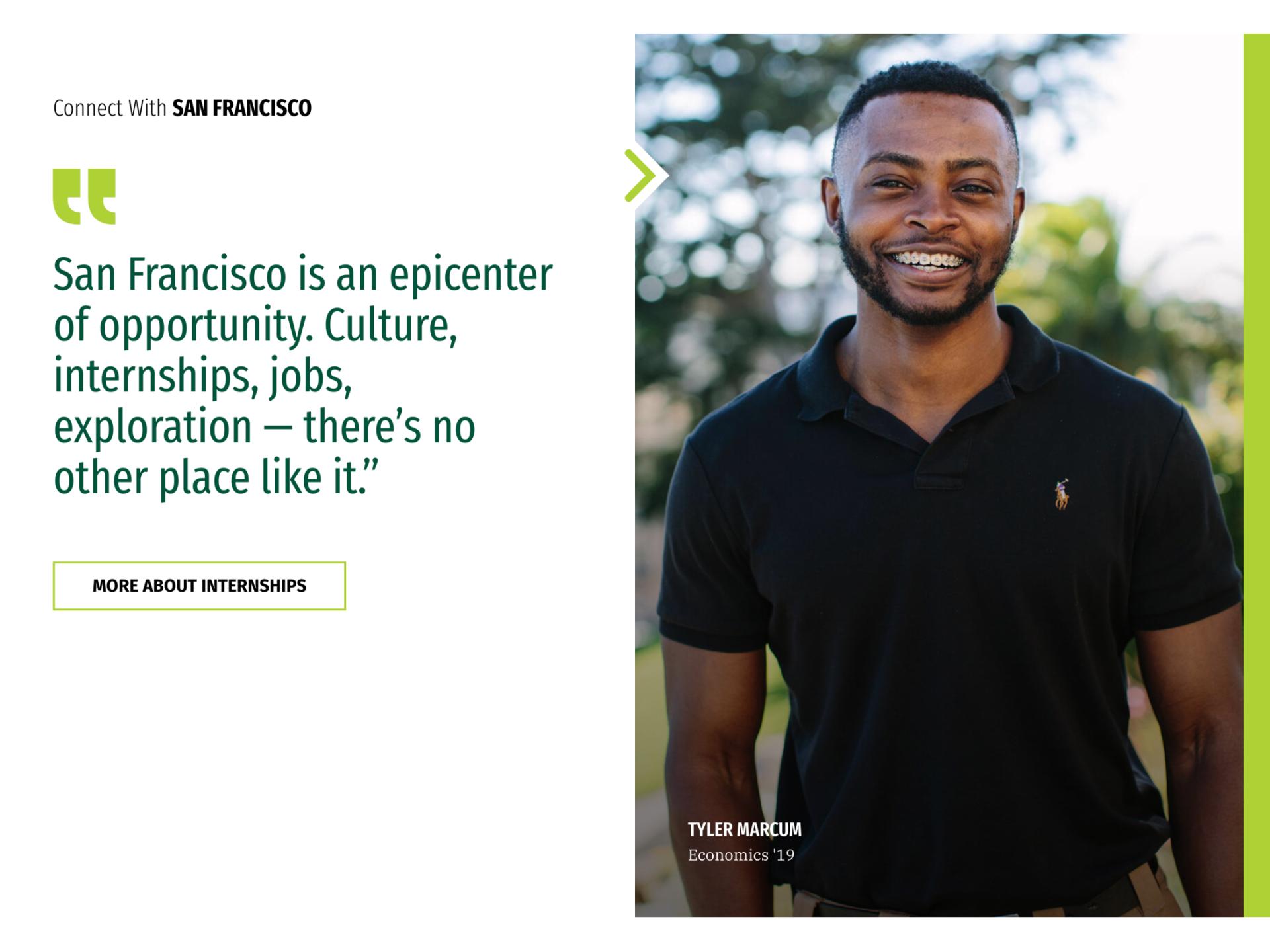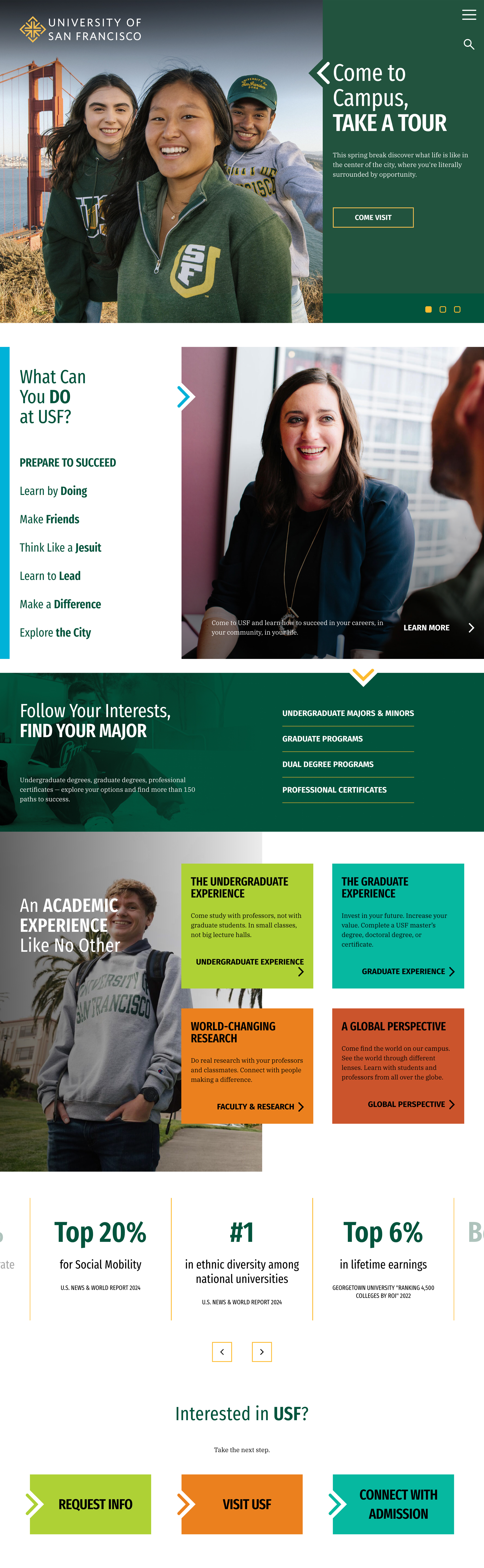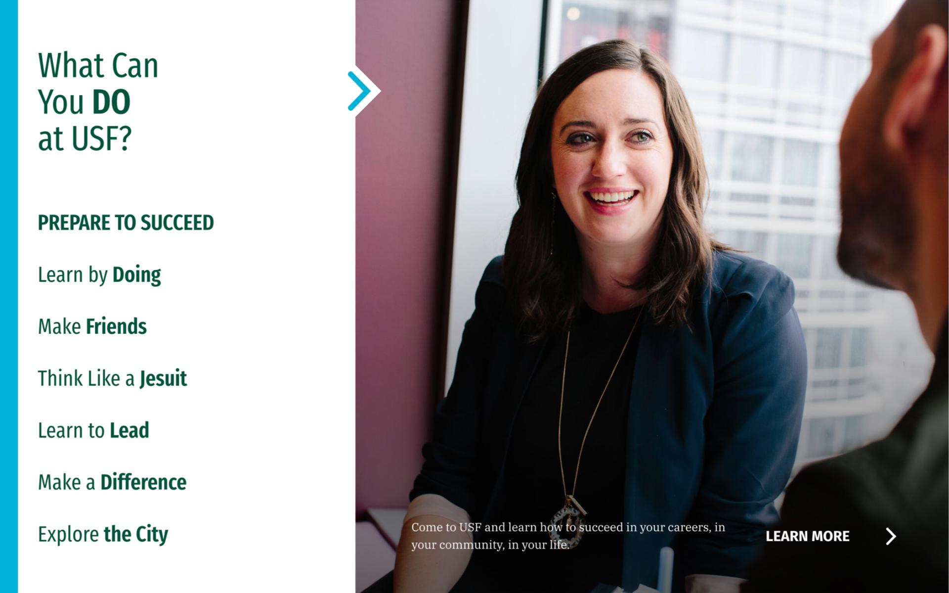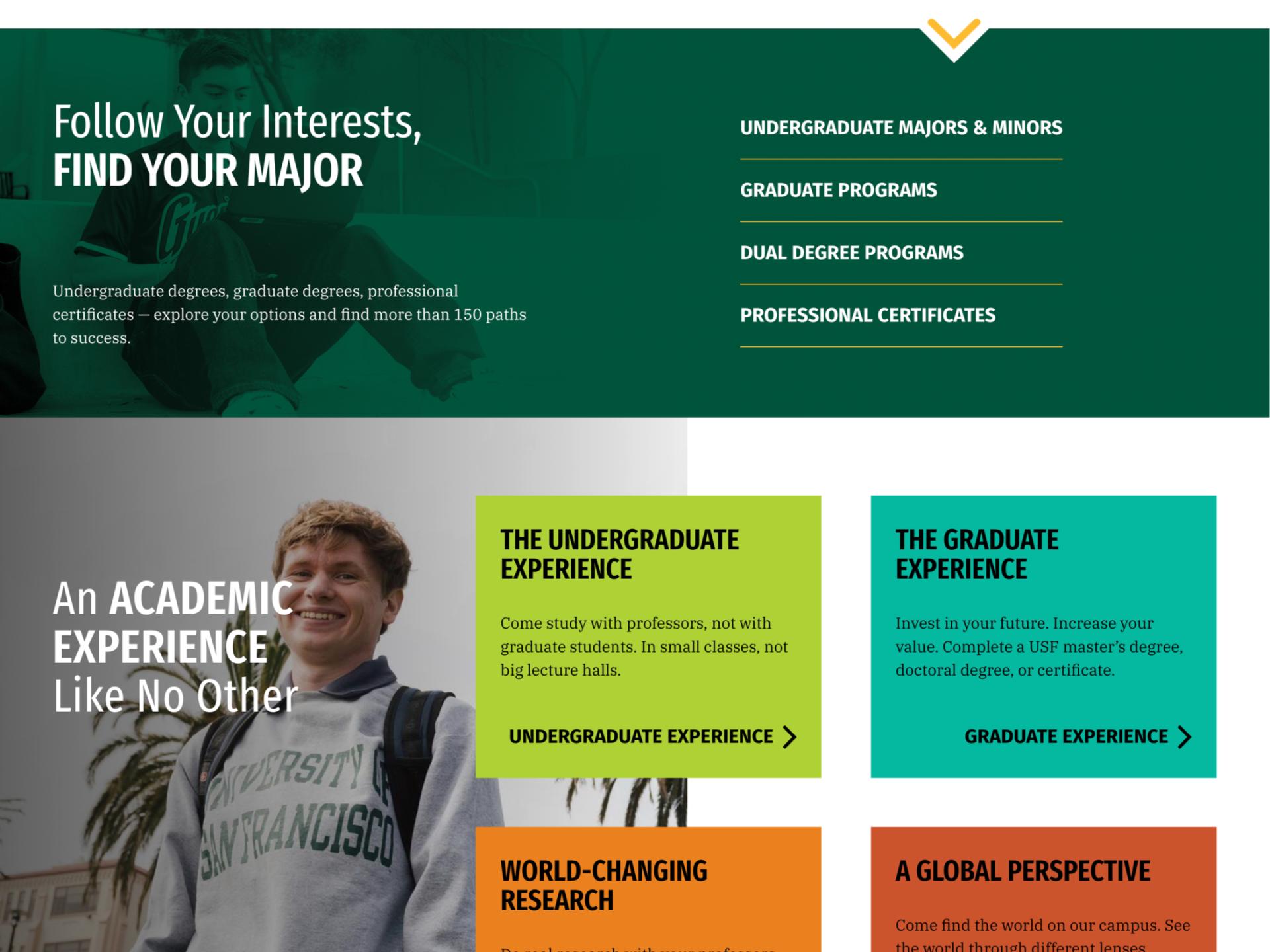 From our research, we crafted editorial guidelines that emphasize USF's core values, focusing on its identity as a center for discovery and a force for change rooted in the Jesuit tradition. These guidelines ensure that USF's commitment to fostering authentic relationships, questioning conventional wisdom, and empowering informed action resonates consistently throughout the website's content. Paired with the expression of the school's ethos, the guidelines also showed communicators how to talk about the real-world student experience at USF and its impact on student outcomes.